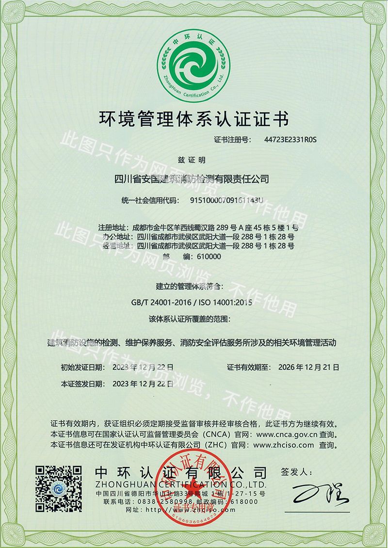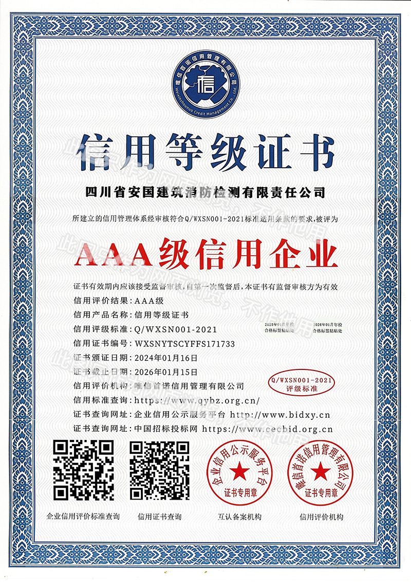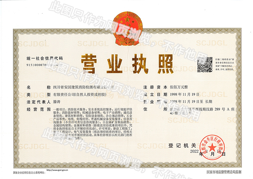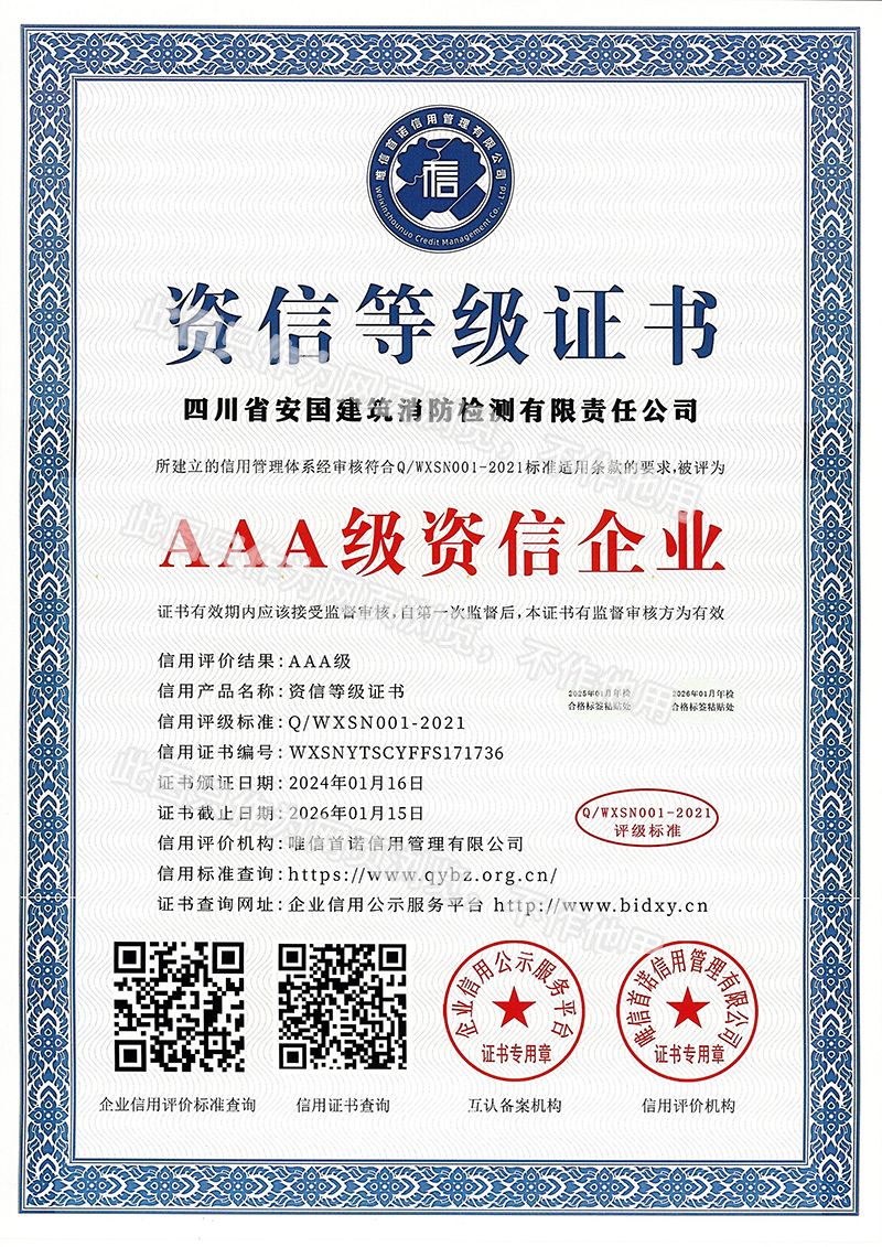 四川省安國建筑消防檢測有限責(zé)任公司,成立于1998年,經(jīng)四川省公安消防總隊批準,工商部門注冊的獨立法人單位。
